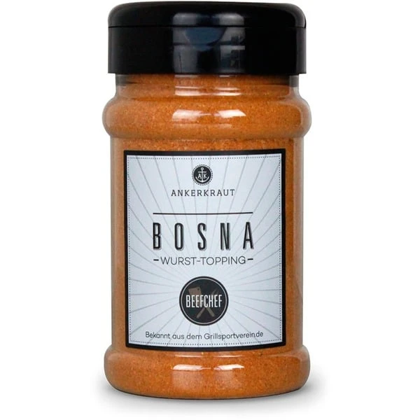 Es heißt Bosna und ist ein Wurst-Topping. Und es schmeckt unfassbar lecker. Ankerkraut ist sich einig: Der BeefChef ist zu Recht ein bunter Hund im Grillsportverein. Der Mix aus Currypulver, Meersalz, Rohrzucker, Zwiebel, Senfmehl, geräucheter Paprika und Cayennepfeffer gibt der Bratwurst so richtig Feuer. Da kann jedes Currywurst-Topping einpacken und erst mal Platz machen! Also zuschlagen – die erste Wurst liegt schneller auf dem Rost als man gucken kann!Art.-Nr.: 1546754