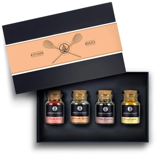 Manchmal steht man einfach auf dem Schlauch wenn es um Geschenke geht. Das will Ankerkraut nicht und bietet deshalb Geschenksets zu allen passenden Anlässen fertig verpackt an. Wie zum Beispiel das Set „Kitchen Basics“ mit 4 Korkengläsern, welches die Küche des Beschenkten einmal grundausstatten möchte. Besonders zur Einweihung der neuen Wohnung oder der neuen Küche passt dieses Set wie die Faust auf’s Auge. Es kommt in einem festen Karton, der mit edlem schwarzen Papier bezogen ist. Den letzten Schliff bekommt das Geschenkset durch eine Banderole.Art.-Nr.: 1546936
