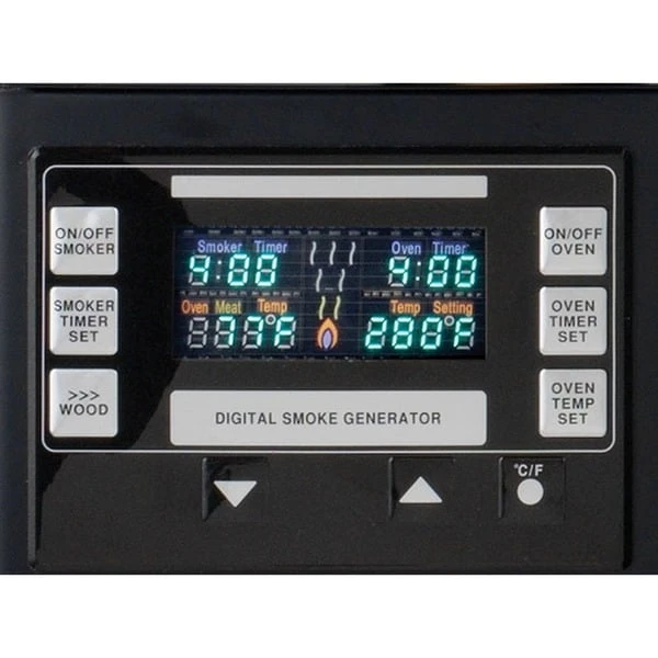 | Bedienung | Funktionen | Digitalanzeige, programmierbares Display, 3 separate Funktionen einstellbar: Ofentemperatur (wird automatisch gehalten), Garzeit (nach Ablauf der Zeit schaltet sich das Heizelement ab), Räucherzeit (unabhängig von der Garzeit) | |