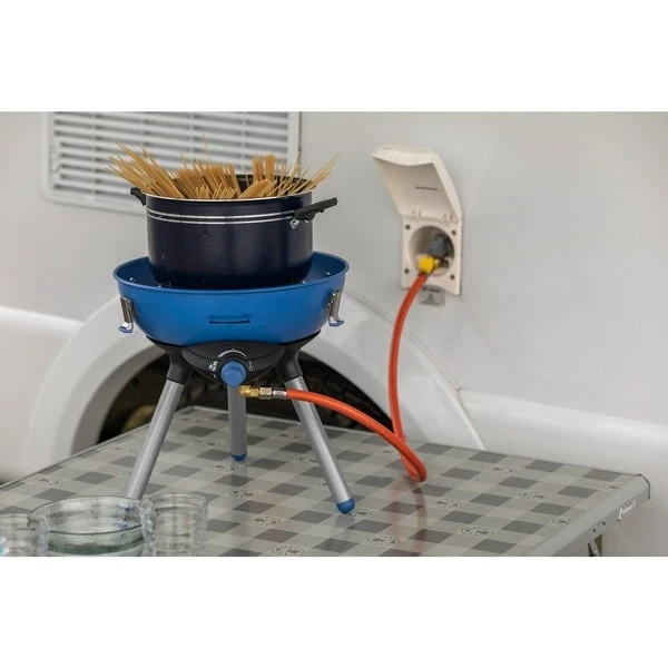Der Party Grill 400 Caravan Connect von Campingaz ist ein leistungsfähiger und vielseitiger 30mbar Campingkocher mit Anschluss für die externe Gassteckdose des Wohnwagens. Er bietet den Campern die Wahl zwischen fünf verschiedenen Koch- oder Grillflächen, und ist damit bestens für den Einsatz auf dem Campingplatz geeignet. Zum Kochen vieler verschiedener Gerichte bietet der Party Grill 400 Caravan Connect Gaskocher die Wahl zwischen normaler Kochflamme, Grillen auf dem Gitterrost, wendbarer Grillplatte und dem Deckel, der sich als Wok umfunktionieren lässt. Die Zündung des Campingkochers ist dank der Piezozündung bei jedem Wetter schnell und einfach, während der integrierte Wasserbehälter das heruntertropfende Fett sammelt, für eine leichte Reinigung nach dem Gebrauch. Der Party Grill 400 Caravan Connect ist dank seines verschließbaren Deckels ultra-portabel. Alle Bestandteile des Party Grill können im Inneren untergebracht werden und sind dort bis zum nächsten Einsatz sicher aufgehoben. Sogar die Beine lassen sich im Inneren verstauen und sind im Handumdrehen wieder an- oder abgebaut.Art.-Nr.: 1863436