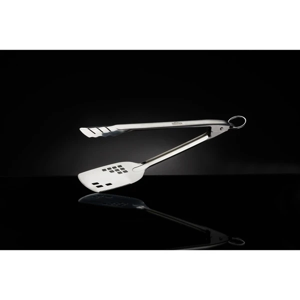 Der Napoleon 2 in 1 Zangenwender 55019 ist ein Multitool für den Grill, aus hochwertigem Edelstahl gefertigt und spülmaschinengeeignet. Man benutzt den Wender für größeres Grillgut wie Steaks oder Burger. Dank der abgeschrägten Kanten der flachen Wenderseite kann man das Grillgut ganz einfach anheben und vor dem Servieren mit der Schneidekante in Portionen teilen. Mit der integrierten Zange lässt sich auch sensibleres Grillgut einfach anfassen. Mit der Zange kann man zum Beispiel Fisch oder große Steaks fixieren, die beim Wenden etwas Unterstützung benötigen. Ein spezieller Federmechanismus sorgt für Stabilität und Kontrolle in der Ausführung, während der Schließmechanismus eine kompakte Aufbewahrung des 2 in 1 Zangenwenders ermöglicht und auch noch einen Flaschenöffner beinhaltet. Art.-Nr.: 1404506