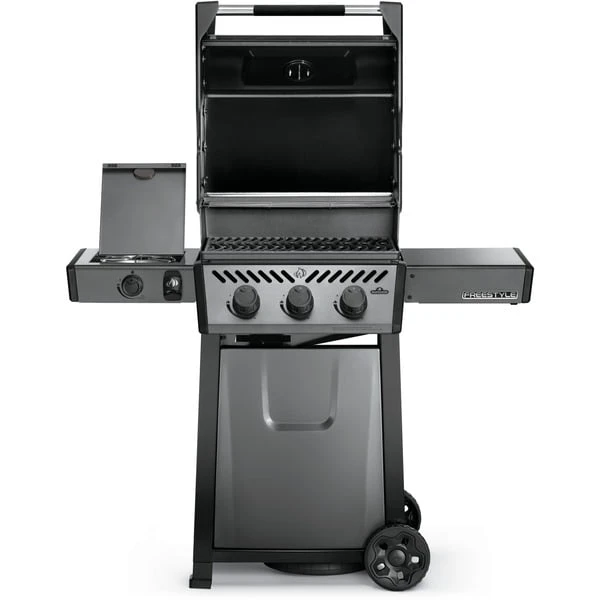 Der Napoleon Freestyle 365 SB Graphit ist ein kompakter Gasgrill mit Seitenkocher, erstklassigen Funktionen und unschlagbarem Preis-Leistungsverhältnis. Der Flammenstrahl des JETFIRE Zündsystems zündet die Hauptbrenner schnell, einfach und zuverlässig. Die Iconic Wave-Grillroste aus Gusseisen und die emaillierten Flammenschutzbleche ermöglichen eine gleichmäßige Hitze-Verteilung und ein perfektes Anbraten. Die Porzellanbeschichtung schützt sie dabei vor Rost. Der langlebige Feuerkasten aus Aluminiumguss reflektiert die Hitze des Grills und erzeugt so eine konvektive, backofenähnliche Umgebung und hervorragende Grillergebnisse. Die Temperatur der drei Edelstahlbrenner kann mit den ergonomischen Bedienknöpfen präzise gesteuert und über das integrierte Thermometer einfach kontrolliert werden. Die klassische Edelstahlblende und der Carbonfarbton verleihen dem leicht ablesbaren Thermometer einen stylischen Retrolook. Bei dem Freestyle SB-Modell verbirgt sich in der linken Seitenablage außerdem ein Kochfeld, für leckere Pfannengerichte, Soßen und Beilagen. Die schöne Graphit-Porzellanbeschichtung schützt den Deckel vor Abnutzung, Wettereinflüssen und Fingerabdrücken. Der Soft-Touch-Griff mit weicher Oberfläche ist wärmeabweisend und sorgt beim Öffnen und Schließen der Grillhaube für eine angenehme Griffigkeit. Auch die Reinigung des Gasgrills Freestyle 365 SB Graphit fällt anschließend dank der seitlich zu entnehmenden Fettauffangschale ganz leicht. Mit den beiden robusten Rollen kann der Grill leicht an jeden gewünschten Ort geschoben werden, und der geschlossene Unterschrank schützt die Gasflasche und den Wagen vor Umwelteinflüssen. Mit einer festen und einer einfach ausklappbaren Seitenablagen mit Aufhängern für Grillbesteck sowie einem Flaschenöffner ist der Freestyle für jede Gartenparty umfassend ausgestattet.Art.-Nr.: 1680027