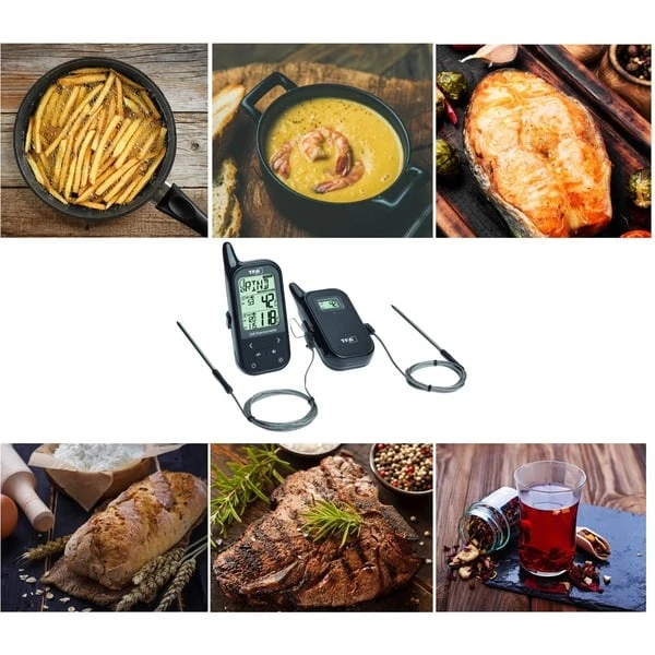 Fleisch und Geflügel perfekt auf den Punkt gebraten! Die Besonderheit: der Küchen-Chef Twin hat gleich zwei Edelstahlfühler. Damit kann wahlweise die Garraumtemperatur vom Grill oder Backofen mit Temperaturober- und Untergrenze oder die Kerntemperatur von maximal zwei Brat- oder Grillstücken überwacht werden. Und dazu muss man sich nicht einmal in der Küche aufhalten – per Funk werden die gemessenen Werte vom Sender an das Hauptgerät übertragen. So kann man die Zeit sinnvoll nutzen und schon mal die Gäste empfangen, solange der Braten noch im Ofen schmaucht oder auf dem Grill liegt. Ist die gewünschte Kerntemperatur erreicht oder bleibt die Ofentemperatur nicht innerhalb der einprogrammierten Grenzwerte, wird man per Signalton darauf aufmerksam gemacht. Art.-Nr.: 1836964