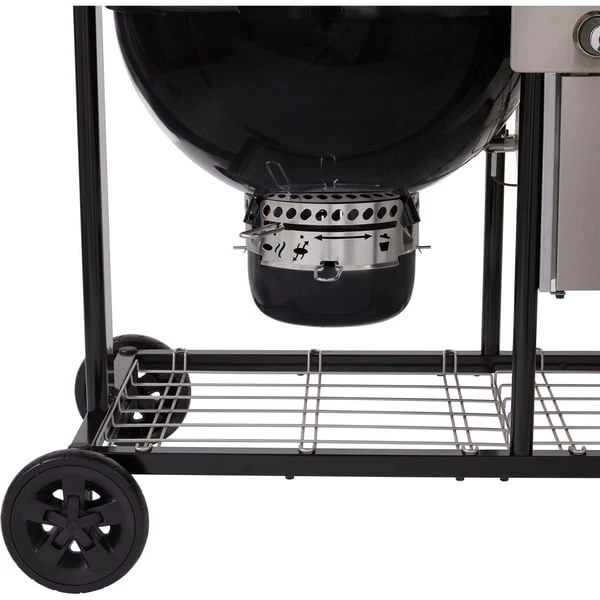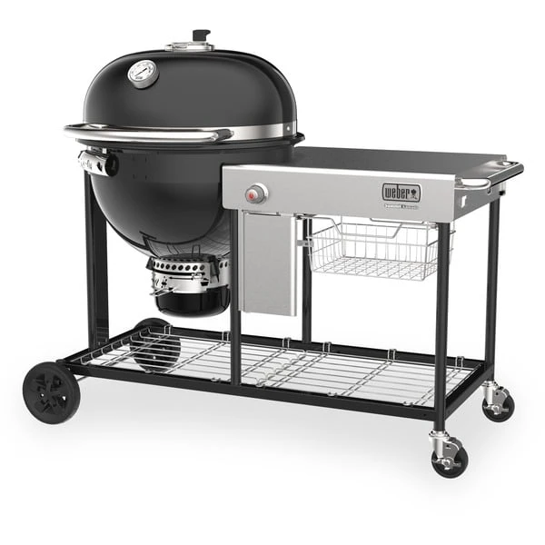 Das Holzkohlegrill-Center Summit Kamado S6 von Weber aus langlebigem, doppelwandig isoliertem Stahl erreicht schnell die gewünschten Temperaturen, hält die Hitze konstant, und dank des Snap-Jet Gas-Anzündsystems ist das Anfeuern der Holzkohle extrem einfach auf Knopfdruck. Damit eignet er sich für ganztägiges Räuchern, während gleichzeitig die benötigte Holzkohlemenge minimiert wird. Mit der besonders großen Grillfläche von 61cm Durchmesser kann man mit dem Summit Kamado auf jedem Fest auch für viele Gäste grillen. Durch einfaches Umsetzen des Grillrosts kann man den Kamado in einen normalen Holzkohlegrill verwandeln, um Steaks anzubraten, Hähnchen zu grillen oder Fisch zu räuchern. Der 2-fach verstellbare Holzkohlerost ist ideal zum Räuchern oder Anbraten bei hoher Hitze. Der Deckellüfter Rapidfire fördert dabei den Luftstrom, um schnell eine hohe Hitze zu erreichen. Der Summit Kamado S6 ist mit dem integrierten Gourmet BBQ System ausgestattet, mit den unterschiedlichen separat erhältlichen Einsätzen kann man seiner Phantasie beim Grillen freien Lauf lassen. Der offene Grillwagen mit Edelstahl-Seitentisch, Korbschublade und großer Gitter-Ablage bietet jede menge Stauraum für Grillbestecke und Zutaten. Das One-Touch-Reinigungssystem ermöglicht nach dem Essen ein problemloses Säubern des Grills. Die Stahlkonstruktion und die porzellanemaillierte Beschichtung sorgen für eine besonders lange Haltbarkeit.Art.-Nr.: 1694185